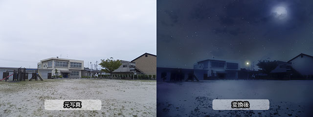 また、1枚のjpeg画像からのバリエーション派生も、(実際の撮影よりはクオリティは落ちますが)やろうと思えば可能です。空や天候の調整や、夜間の窓の明かり、室内で窓を暗くするなど、特にゲーム制作などで差分を作る際に多く参考にできるでしょう。