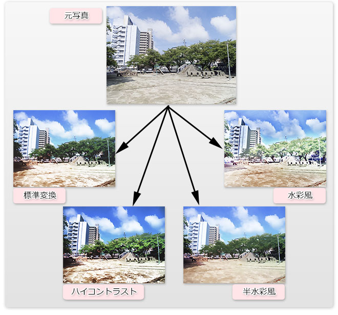 アーティストが表現するような色の理論を新たに追加し、さらにより幅広い表現を実現するノウハウも追加されています。1枚の写真でも、今までの変換方法から、水彩風、ハイコントラストなどの様々な表情をつけて、多くのバリエーションを作ることができるようになります。