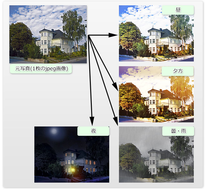 また、1枚のjpeg画像からのバリエーション派生も、(実際の撮影よりはクオリティは落ちますが)やろうと思えば可能です。空や天候の調整や、夜間の窓の明かり、室内で窓を暗くするなど、特にゲーム制作などで差分を作る際に多く参考にできるでしょう。