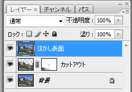 もしカットアウトの段階から修正したい場合、ぼかし(表面)レイヤーは削除して、カットアウトレイヤーを修正後、再びぼかし(表面)レイヤーを作成してぼかし(表面)をかけます。