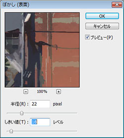 2. ぼかし(表面)レイヤーに、「フィルタ」→「ぼかし」→「ぼかし(表面)」を適用します。パラメータは、3200x2400pixel程度の画像サイズであれば、半径:11~20pixel、しきい値:12~28pixel辺りで綺麗になるように調整します。画像によって適度な量は変化するので、半径、しきい値を動かして、画像ごとに適度な量を模索します。